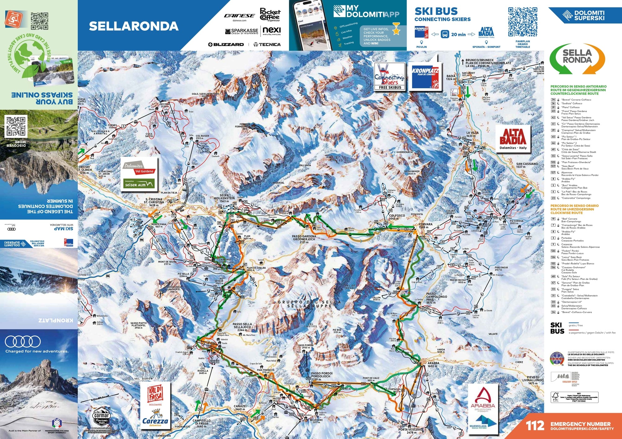 Ośrodek narciarski Alta Badia położony jest w południowo-wschodniej części Południowego Tyrolu. Trasy zjazdowe zlokalizowane są na wysokościach między 1400 – 2778 m. n.p.m oferując łącznie ok. 130 km tras w przeważającej liczbie tras niebieskich (ok. 78 km). Region położony jest centralnie w ośrodku Dolomiti Superski i ma bezpośrednie połączenie ze słynną karuzelą narciarską Sella Ronda. Sama Sella umożliwia przejechanie na nartach czterech najsłynniejszych przełęczy w Dolomitach w ciągu jednego dnia: Passo Pordoi – Passo Campolongo – Passo Gardena – Passo Sella. Trasy zjazdowe tworzą ciąg o łącznej długości prawie 60 km i przebiegają na wysokości od 1465 m n.p.m. do 2300 m n.p.m. Istnieją dwa kierunki poruszania się wokół masywu Sella: Sellaronda zielona (przeciwny do ruchu wskazówek zegara) i pomarańczowa (zgodny z kierunkiem ruchu wskazówek zegara). Większość tras jest o średniej skali trudności.