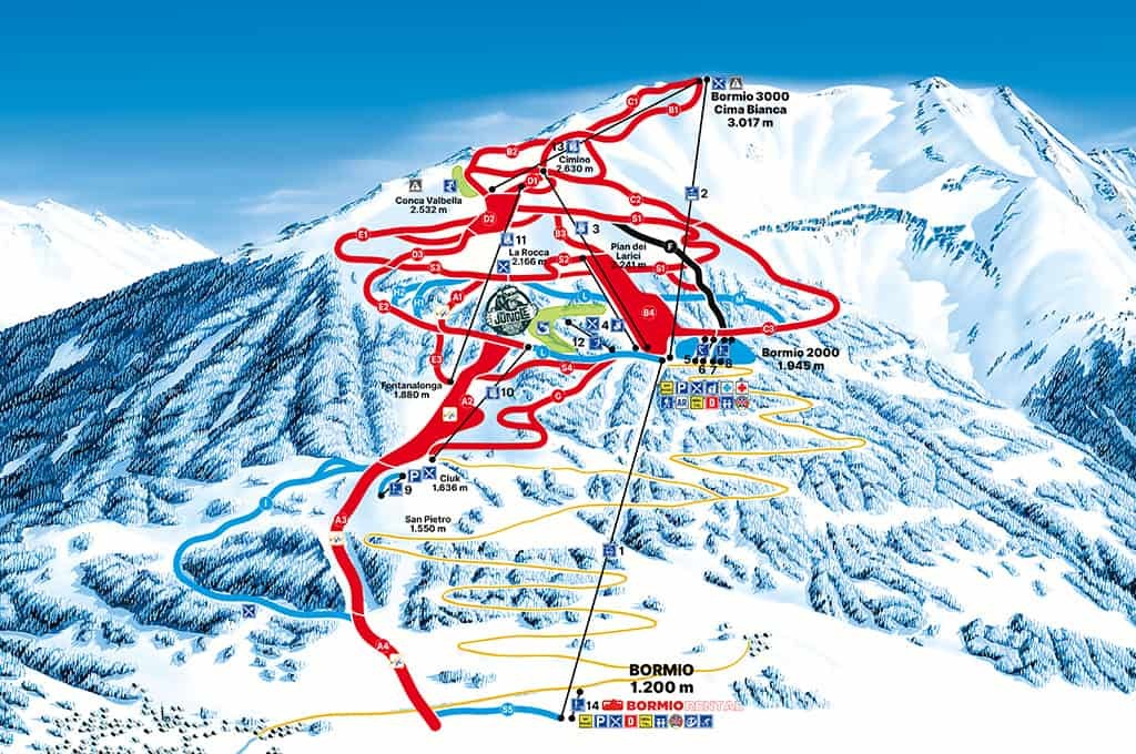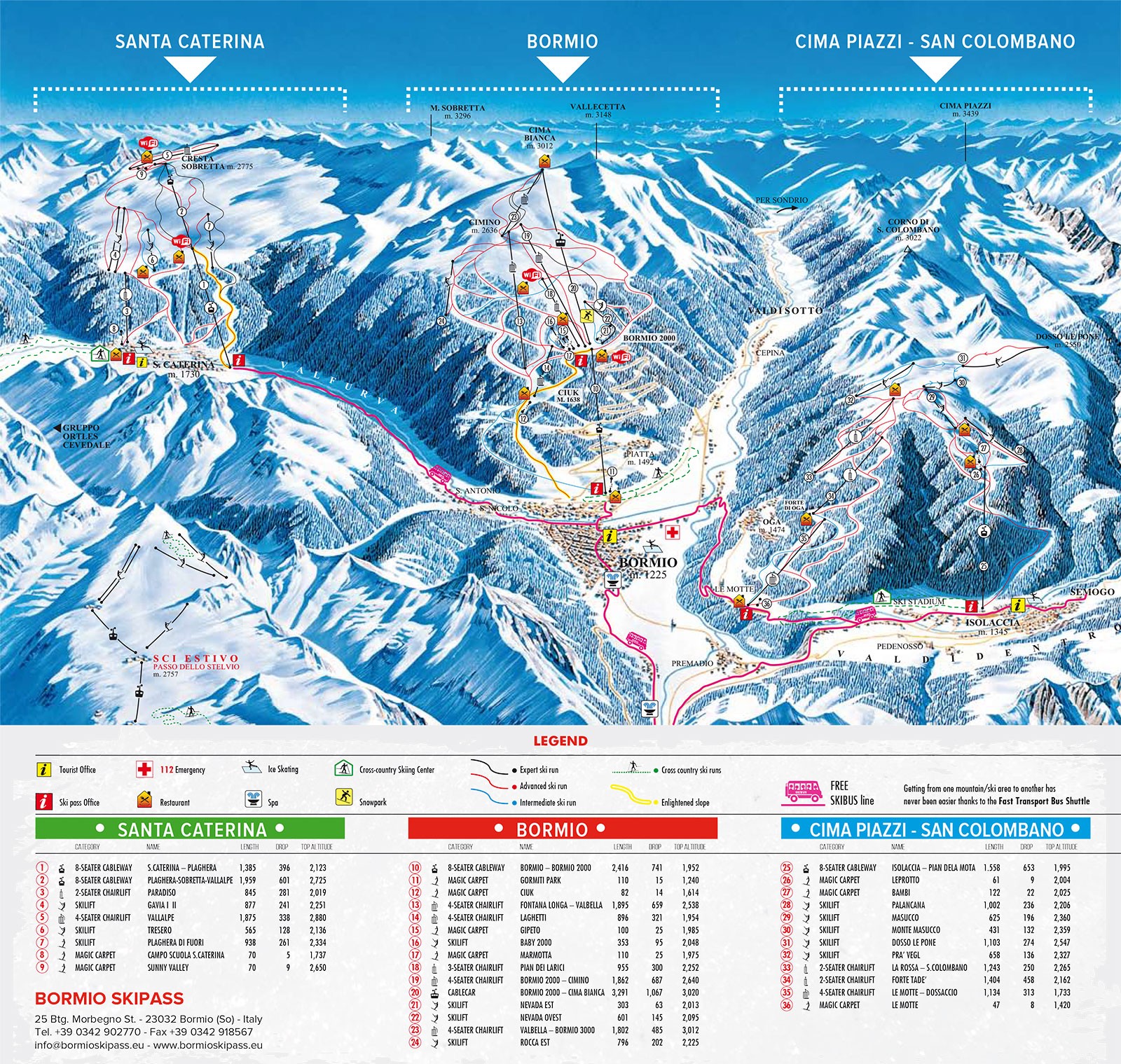 - Skipass Bormio, który obejmuje łącznie 115 km tras i takie regiony jak: Bormio, Santa Caterina Valfurva, Isolacia i San Colombano.
